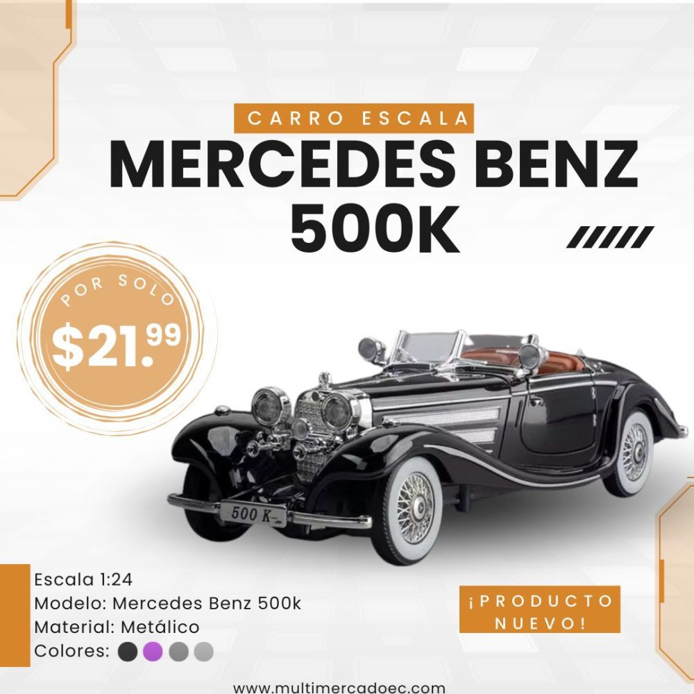 El Mercedes Benz 500K de Multimercado EC es una pieza imprescindible para quienes aprecian la historia automotriz. Esta réplica a escala 1:24 rinde homenaje a uno de los autos más bellos jamás construidos, destacando por su imponente parrilla frontal cromada y sus líneas fluidas que definieron el lujo europeo de su época.