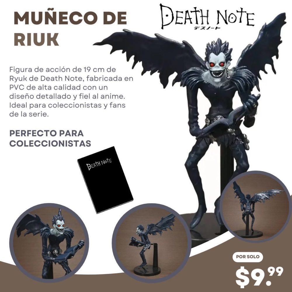 ✨ 🌟 ¡No dejes que tu colección se quede en el mundo humano! 🌟 ✨ Esta figura de Ryuk captura perfectamente la mirada penetrante y las alas oscuras del Shinigami más famoso. 💥 Es la pieza que faltaba para darle ese toque épico y oscuro a tu habitación. ¡Se siente como si acabara de salir de las páginas del manga directamente a tus manos! 🍎💀