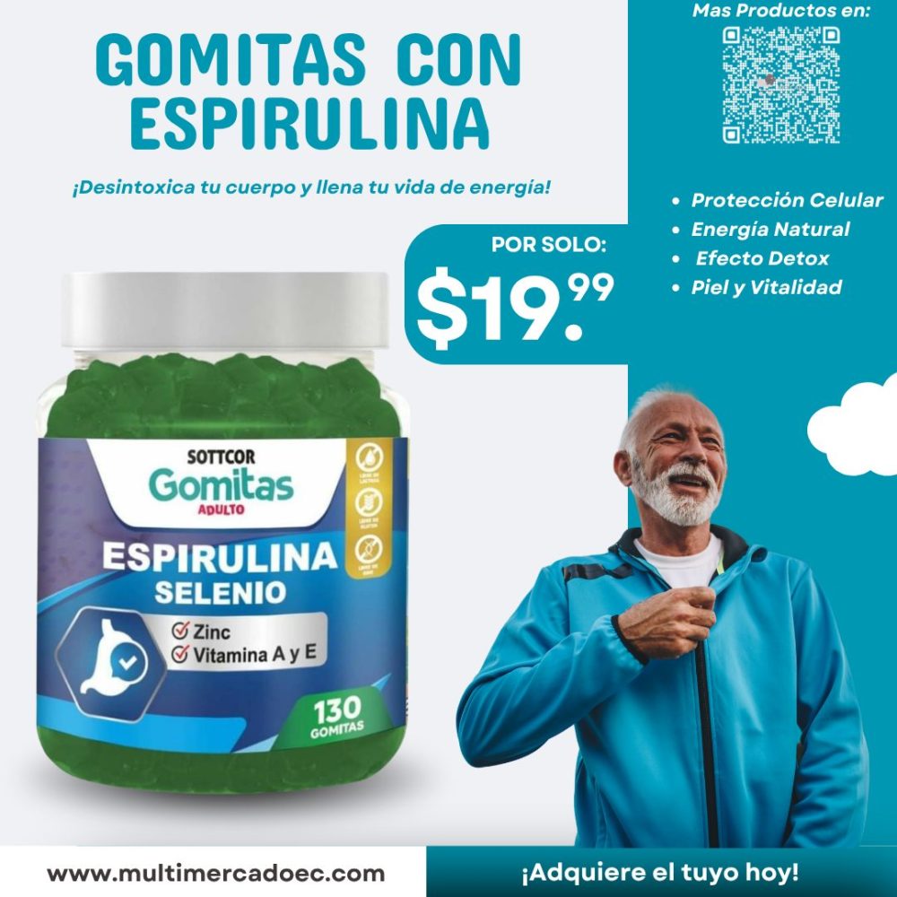 En Multimercado EC seleccionamos lo mejor para tu bienestar integral. Las Gomitas con Espirulina y Selenio combinan el superalimento más completo del mundo con minerales esenciales y vitaminas (A y E) para ofrecerte una nutrición celular completa. Es la opción perfecta para revitalizar tu cuerpo, mejorar tu metabolismo y lucir una piel radiante sin complicaciones.