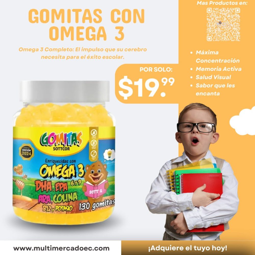 En Multimercado EC sabemos que el rendimiento escolar empieza con una buena nutrición. Las Gomitas con Omega 3 (Sottcor Kids) combinan ácidos grasos esenciales (DHA, EPA, ARA) con Colina, Vitamina B12 y Potasio, creando una fórmula poderosa que alimenta el cerebro y fortalece el sistema nervioso. Su increíble sabor asegura que a los niños les encante tomarlas cada día.