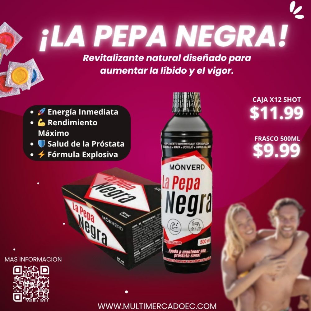 En Multimercado EC traemos soluciones diseñadas para el hombre que busca excelencia. La Pepa Negra es un potente revitalizante líquido que actúa como un vigorizante de amplio espectro. Su fórmula avanzada ayuda a mejorar la circulación y el flujo sanguíneo hacia la zona íntima, garantizando una respuesta más firme, mayor sensibilidad y una energía inagotable.